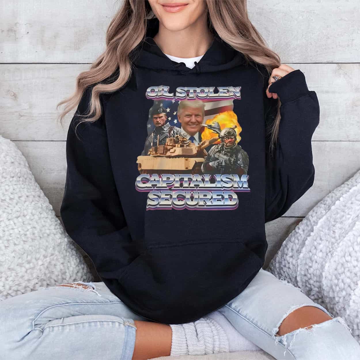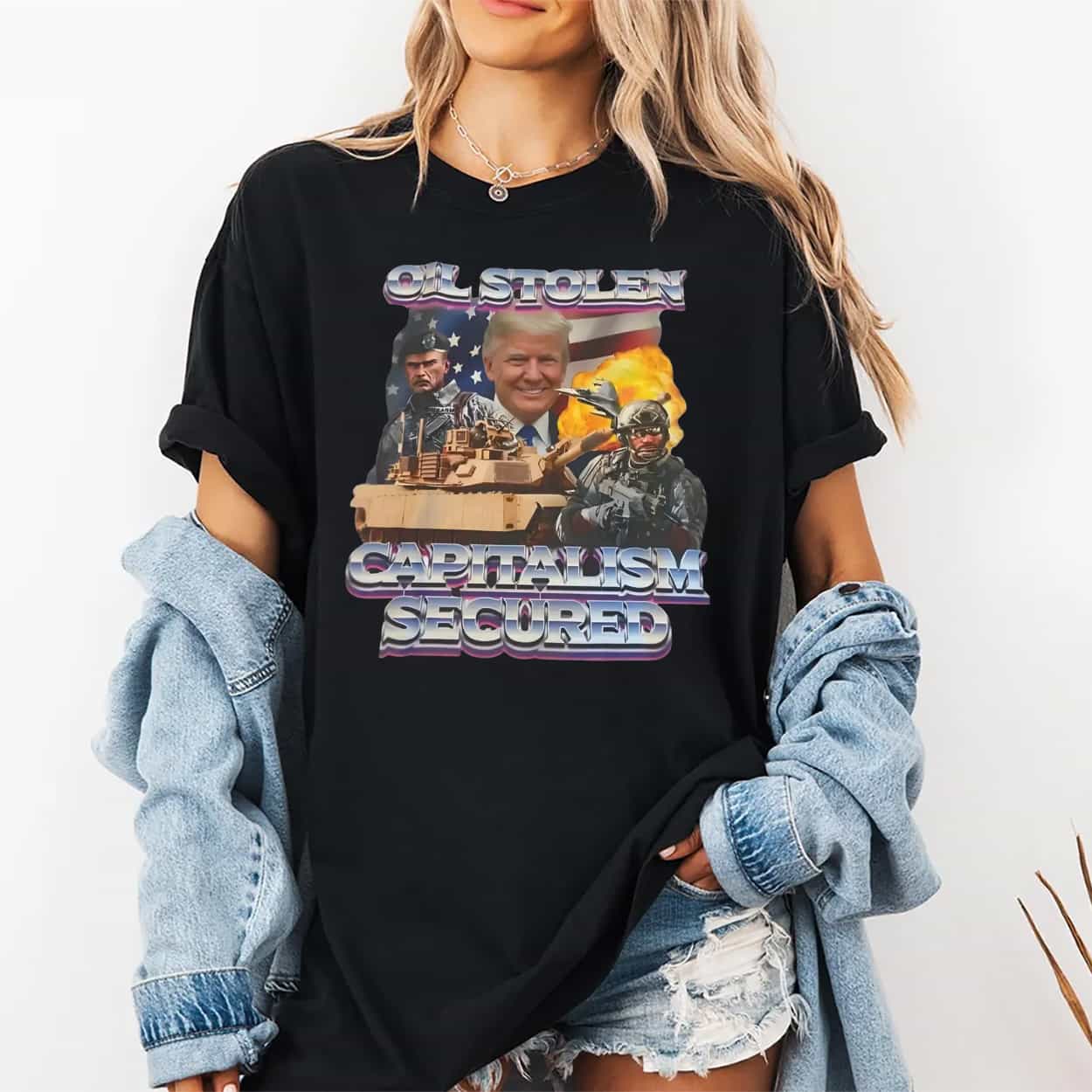 Wear the internet’s favorite satirical victory lap with this Trump Oil Stolen Capitalism Secured Shirt. Designed in the style of a vintage 90s “bling era” rap album cover, this shirt features chrome typography, military chaos, and a smiling Donald Trump. It’s the ultimate piece of ironic streetwear for meme lords and political junkies. Secure the drip and the resources today.