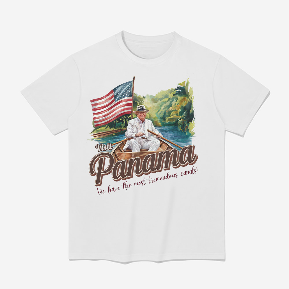 Inspired by Trump’s larger-than-life persona and his knack for memorable quotes, this shirt humorously imagines him promoting the Panama Canal with his signature flair. The design captures a patriotic spirit with the American flag, while the canal backdrop nods to Panama’s iconic waterway, blending global geography with political satire. It’s a statement piece for those who enjoy lighthearted commentary on politics, appealing to bold thinkers who aren’t afraid to wear their humor on their sleeve—literally.