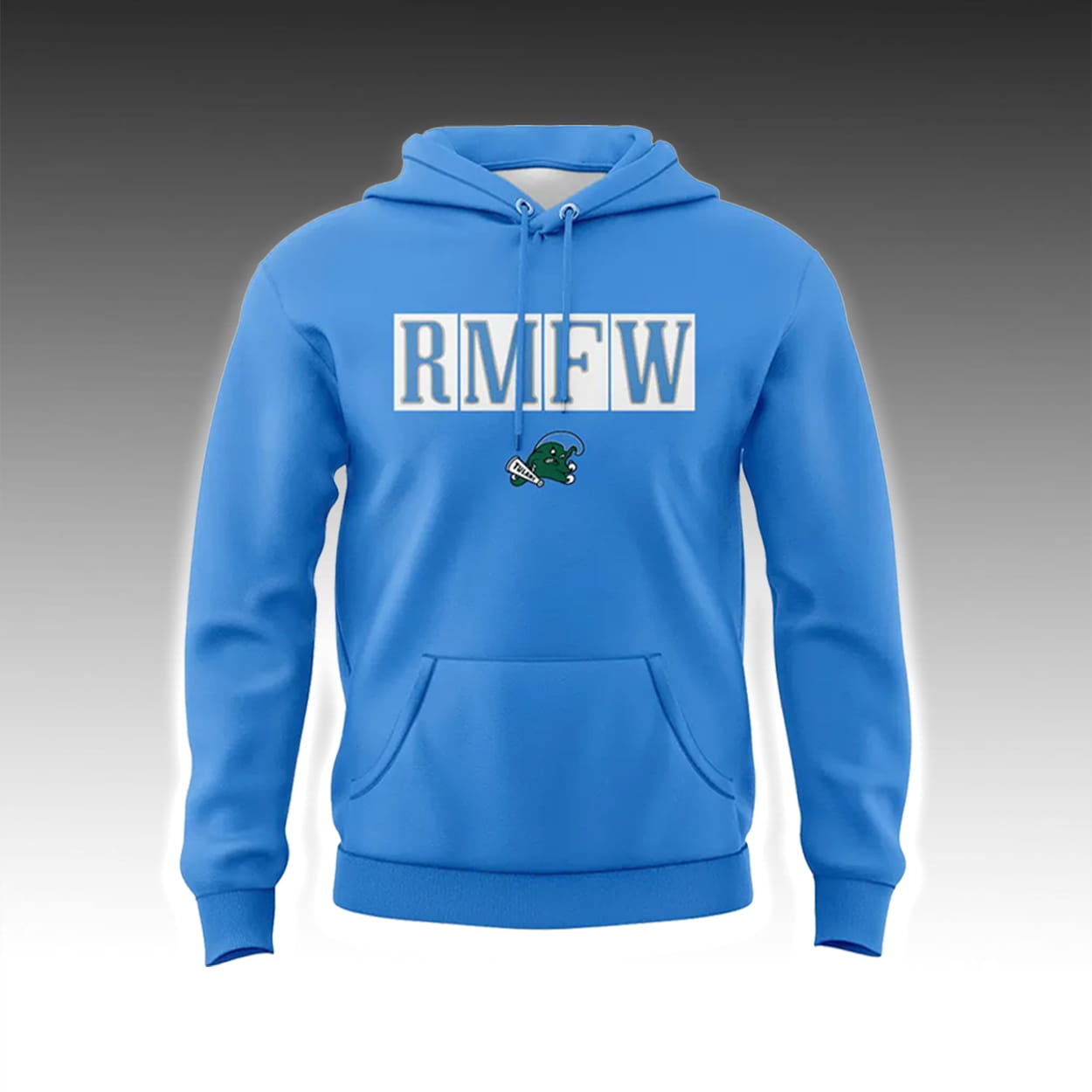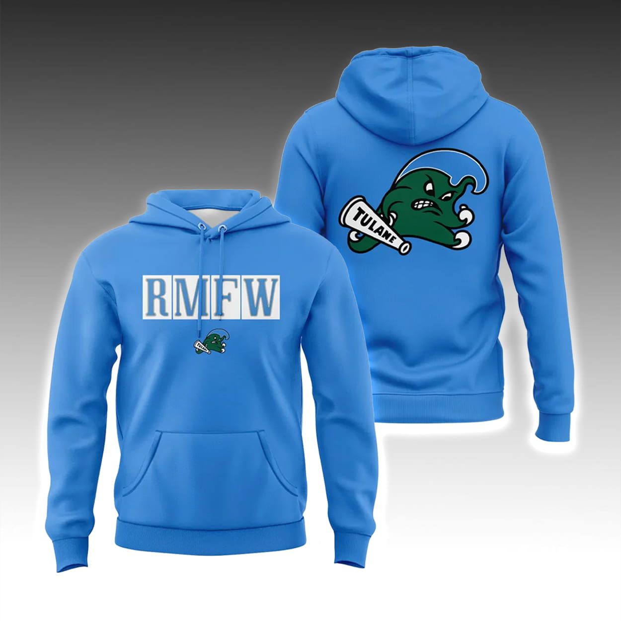 The Tulane Coach Jon Sumrall RMFW Hoodie delivers bold school spirit with its clean RMFW letter design on the front and the fierce Angry Wave graphic on the back. This hoodie recreates the exact style Coach Sumrall wore during his Tuesday media conference, turning a simple moment into a viral fan favorite. From its vivid blue color to the crisp lettering and mascot artwork, every detail is designed to stand out on game day, campus, or casual wear.