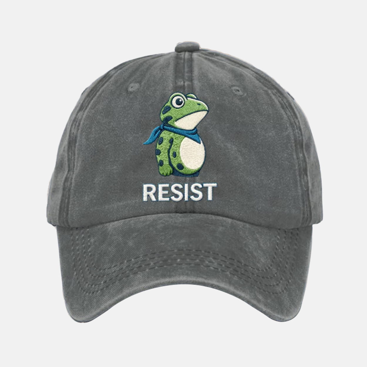 Front-and-center, a green frog raises its fist under crisp “RESIST” lettering — a bold visual shorthand for peaceful dissent. The clean, minimalist embroidery ensures the design is eye-catching without overstatement. With a classic baseball cap silhouette, curved brim, and adjustability, this cap fits all genders and styles.