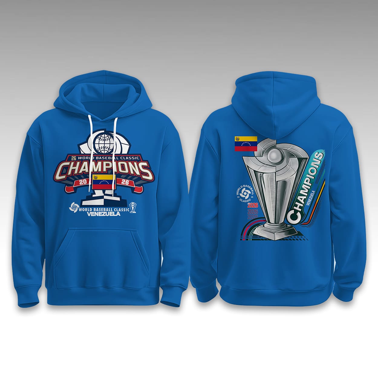 Celebrate a monumental victory with the Venezuela World Baseball Classic Champions 2026 Hoodie! Featuring bold championship typography, the national flag, and an oversized tournament trophy graphic, this pullover is the ultimate tribute. Perfect for devoted fans and sports memorabilia collectors. Elevate your athletic wardrobe and display your national pride on a global stage. Complete your champion look with matching accessories and secure this unforgettable commemorative apparel today!