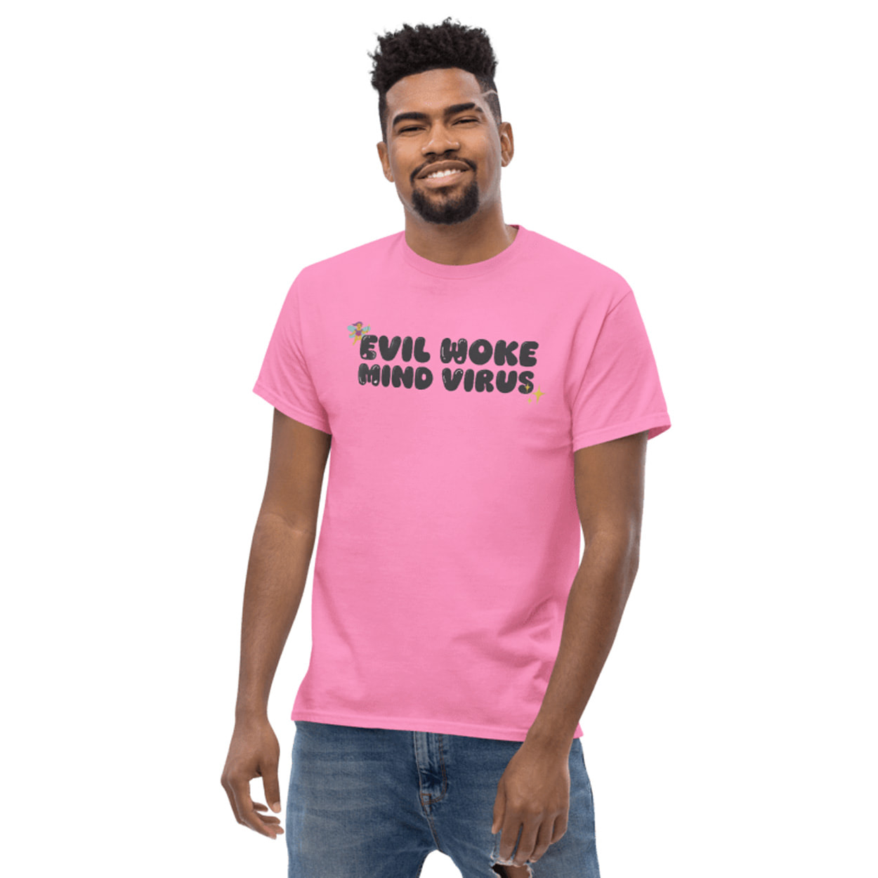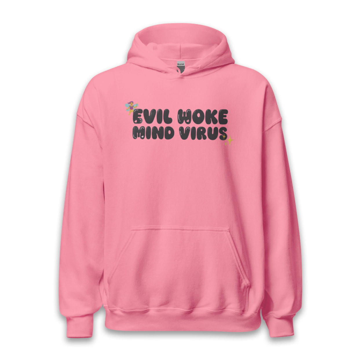 The Vivian Wilson Evil Woke Mind Virus Shirt features the phrase “EVIL WOKE MIND VIRUS” printed across the chest in a rounded bubble font. The design is accented by a small fairy graphic near the top left and a sparkling star icon at the bottom right, adding a lighthearted, sarcastic aesthetic to the bold typography.