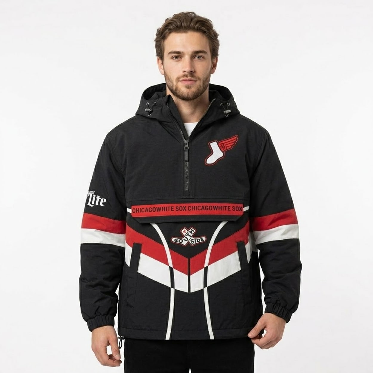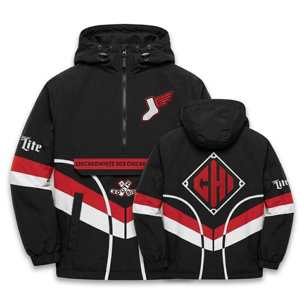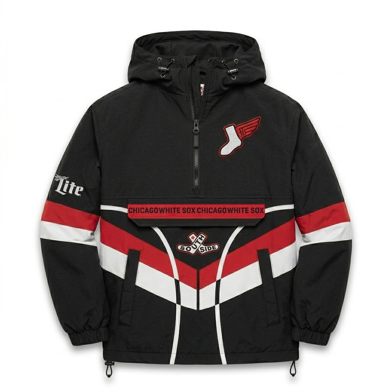 - Front Utility: A functional center pouch stamped with “CHICAGO WHITE SOX” lettering sits directly above a classic “SOUTH SIDE” crest, framed by striking chevron striping across the midsection.