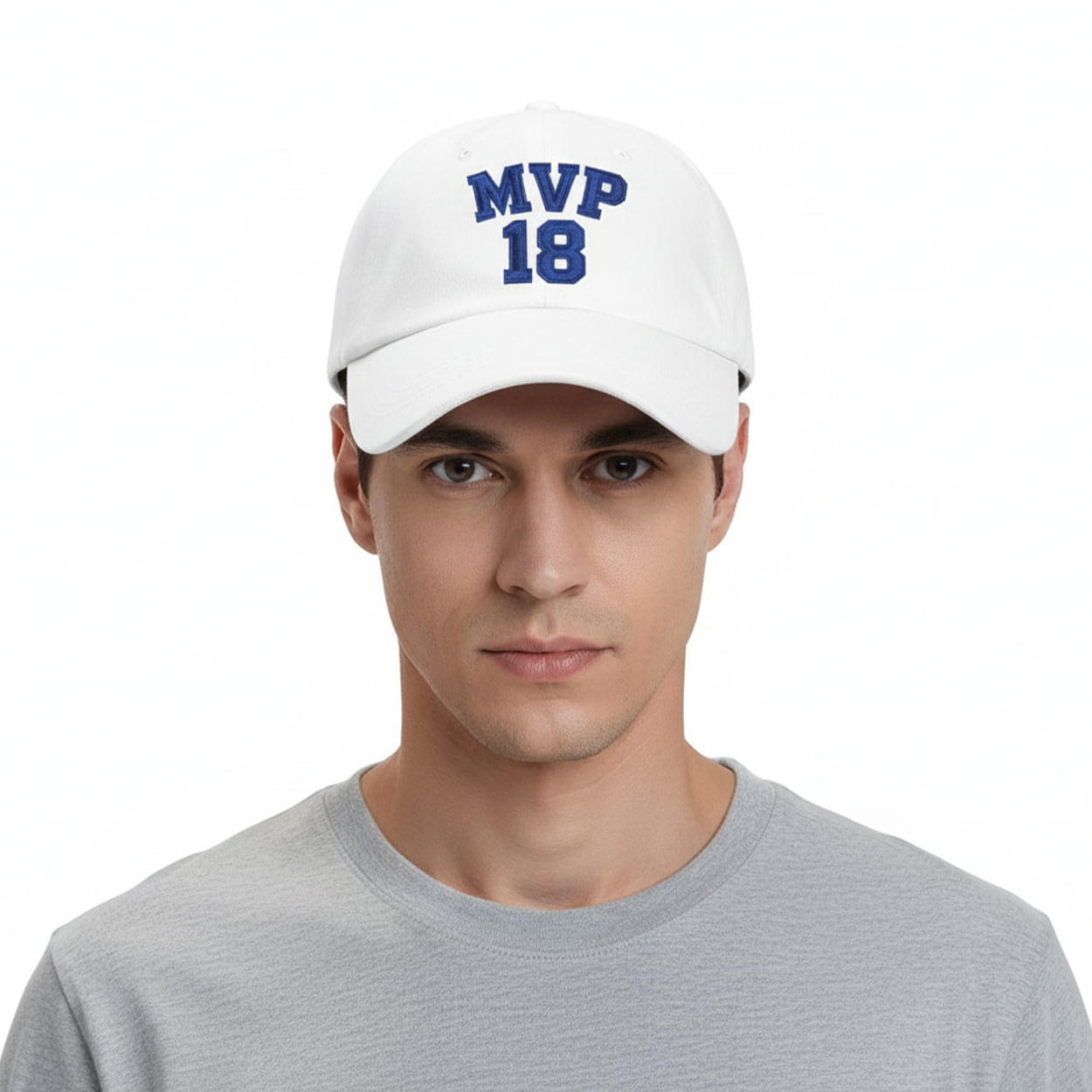 This baseball cap features a simple, classic design with “MVP” and the number “18” embroidered on the front in a bold, Dodger-blue athletic font. The minimalist look is stylish and versatile, making the message clear and unmistakable.